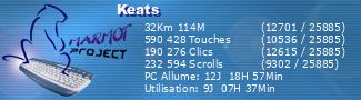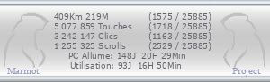 Cotopaxi Posté(e) le 2 novembre 2005 Signaler Posté(e) le 2 novembre 2005 Voici un truc totalement inutile et donc nécessaire. Ce "truc" est un programme qui calcule le nombre de clics de votre souris, le nombre de glissement de la roulette, la distance parcourue par la souris et autres conneries. Toutes ces données sont ensuite envoyées sur un serveur à intervalle régulier et vous pouvez donc voir qui est le plus geek... Je vous l'avais dit, c'est inutile. Vous pouvez ensuite vous la péter avec vos stats de kikoulol dans vos signatures (sauf sur Vossey ). Car vous pouvez mettre vos stats dans une image : Ok, c'est illisible... Pour faire mumuse avec ça : The Marmot Project Pour pouvoir utiliser ce truc, vous devez bien-sûr télécharger et installer le logiciel The Turtle. C'est lui qui comptabilisera tout. Il s'affichera juste dans le system tray sous la forme d'une icône bien moche. Vous pouvez configurer le programme etc.. On peut aussi créer une team Vossey, si les admins et Ben sont d'accord. A eux de voir, mais je crois que Greaver l'a déjà crée (boulay ). Enfin voilà, amusez-vous bien. -------------------------------------- [#0000ff]Participants[/#0000ff] [*]Greaver [*]xasalja [*]Gotika [*]Ak2Spawn [*]wooley [*]thedark [*]KriSpiX [*]danao [*]Spliff [*]AL1 [*]Simcamb [*]ArEs3 [*]OinJ [*]Keats [*]ChandlerBing82 [*]HUmar [*]kaizou [*]BeBer [*]MacEugene [*]AdHoc [*]Hellbarto [*]phil302 [*]Mordrake [*]vanamel [*]Eve [*]LotA [*]Chicobrasil [*]elninho [*]Tantale [*]Timmy [*]chriso [*]Smallvince [*]CarlJonhson [*]RavenHvis [*]OraS [*]AzzA [*]Nautilus [*]Sayotuke [*]KOrBO7 [*]caporaltito [*]LorDMansoN Merci de me PV pour vous faire ajouter à la liste en me donnant le liens vers la signature que je puisse la rajouter. Citer